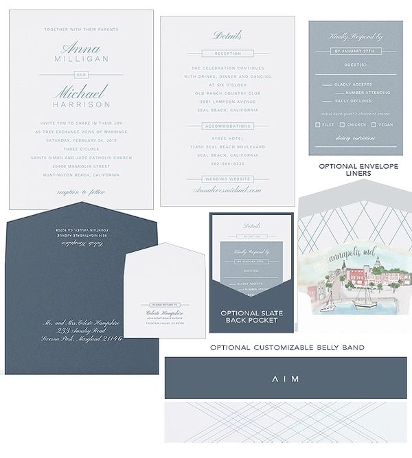 - main envelope (slate blue) w/guest & return address printing printed in white!